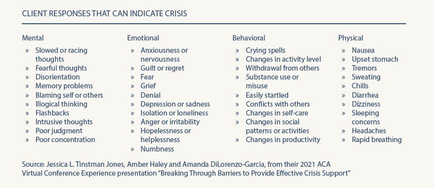 Shock, denial and disbelief are often the first emotions that clients experience in crisis situations, along with hopelessness and helplessness, says DiLorenzo-Garcia, who co-presented on “Breaking Through Barriers to Provide Effective Crisis Support” at ACA’s Virtual Conference Experience this past spring with Jessica L. Tinstman Jones and Amber Haley. A vast range of physical, mental, emotional and behavioral symptoms can indicate that a client is in crisis, she notes. (See list below.)